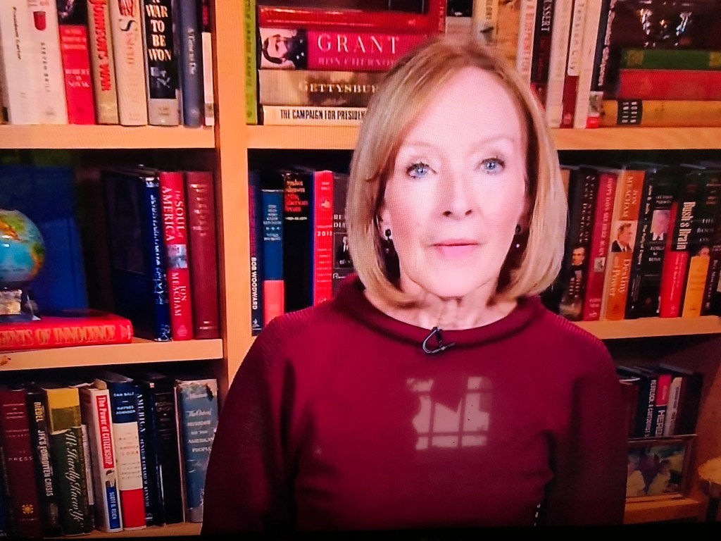 It’s been a log week. We’re up to 77,000 dead from coronavirus and that wasn’t the lead story. Unemployment is at 14.7% and many are saying it’s much worse. That’s the highest unemployment since the Great Depression for those of you keeping score. So, it’s OK to wear a comfort sweater. I would have gone with pearl studs, but she loves the ruby (-colored at least) drops. Speaking of red, she seems to have toned down the strawberry in her strawberry-blonde ‘do.