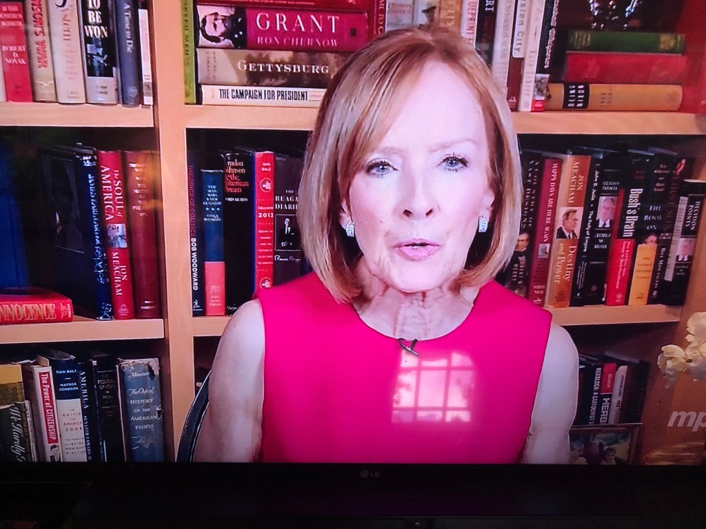 I love the fuchsia sleeveless look on Judy. Some might say it clashes with her strawberry hair, but not me. Same lovely basketweave earrings as last night and I’m ok w/that. This color really flatters her, in my opinion, but eager for your thoughts.