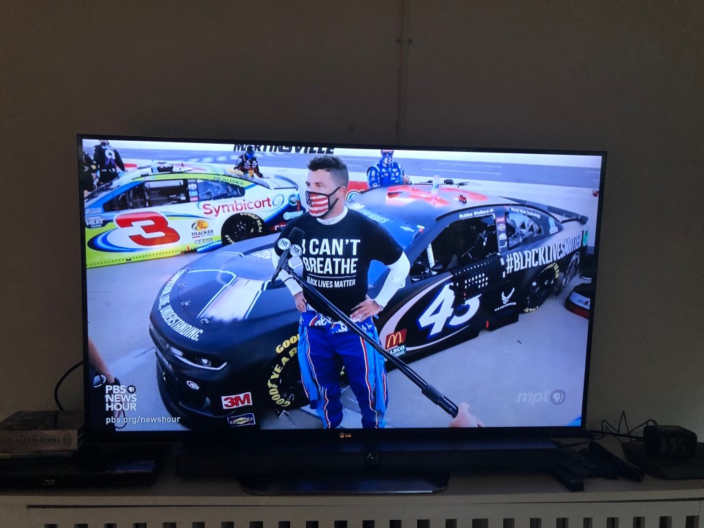 So it’s all the more significant that the first Black NASCAR driver since 1971 is Bubba Wallace (bet you thought that was a white guy’s name). One thing NASCAR drivers ALWAYS know is what they are wearing; they always support their team and /or their sponsors. You can’t see it in this darn picture. I really must hire a decent photographer. Bubba’s wearing a “Richard Petty Racing” shirt. Yes, Bubba Wallace drives the number 43 car. That’s huge in and of itself.
