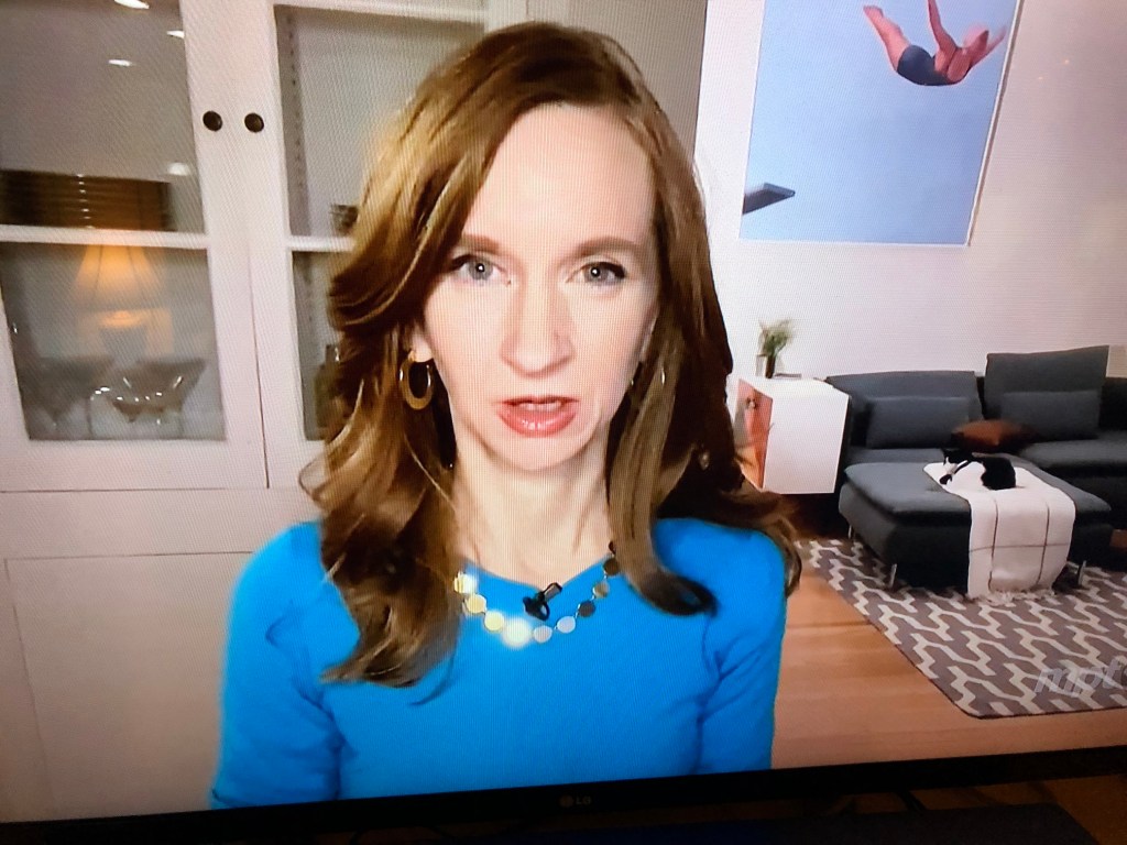 Amna’s branching out, if not in her fashion (yawn), but in how she lets us into her home. Perfect poster for a reporter. I can’t make out the Lichtenstein-like image to her left. This room is more interesting than the living room with someone’s red-spined law books we usually see.