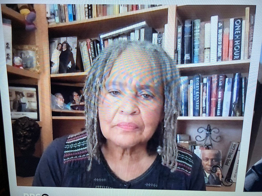 Who doesn’t love Charlayne Hunter-Gault? If you said, “me,” you can stop reading this blog right now. No fashion icon she, but I would love to be her pal. As Mr. Blogger noted, she has the Studs Terkel tome, Race, a strong older work on race studies, instead of one of the authors-of-the moment. She also has a Bobby Kennedy bust off to her right. Plus which she’s 79 and lookin’ sharp.