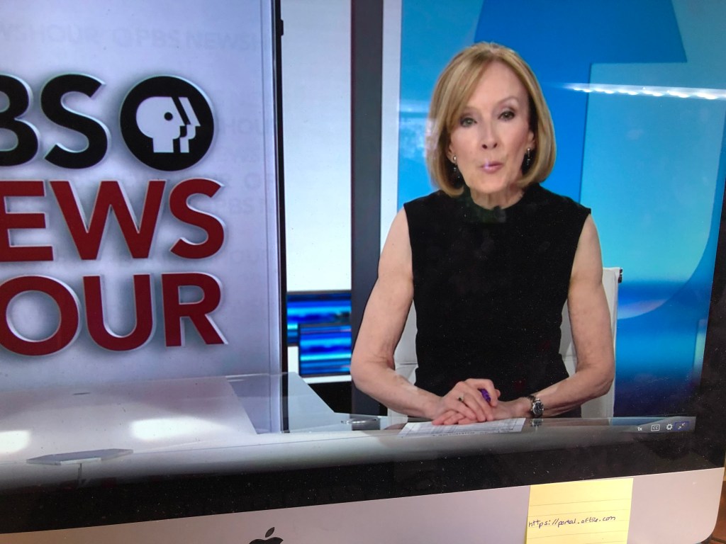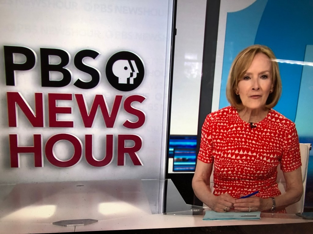 Last evening, Judy wore this fitted red-and-white dress. I like this sleeve length. I am not big on cap sleeves, and my views on tank tops to come, but this sleeve length says “summer” without baring too much.
