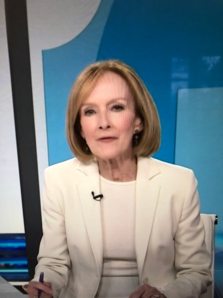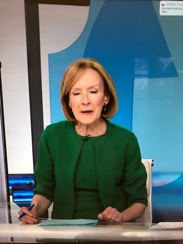 On Tuesday, Judy needed a little rest mid-news hour, but she paired the RIGHT green cardigan with her dress. Love the jacket. At first I thought it was a bolero, but it’s too long for that. The sleeves are just right. Betting this is Akris.