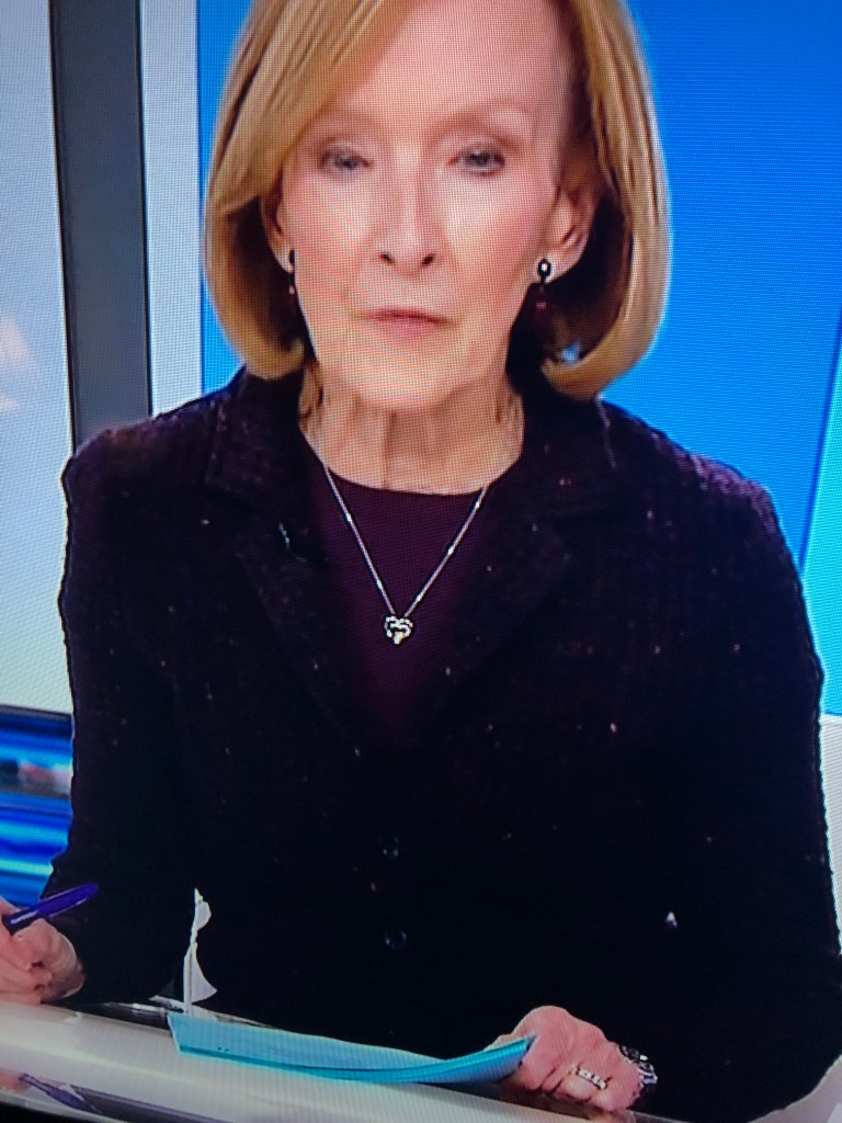 Meanwhile, Judy looked skeptical but stylish on Monday in purple boucle. At least I think that’s what it was. Feel free to correct. As we loyal fans know, Judy typically accessorizes only with earrings, a watch, and what I presume is a wedding/engagement ring combo, but Monday she wore this silver heart necklace.