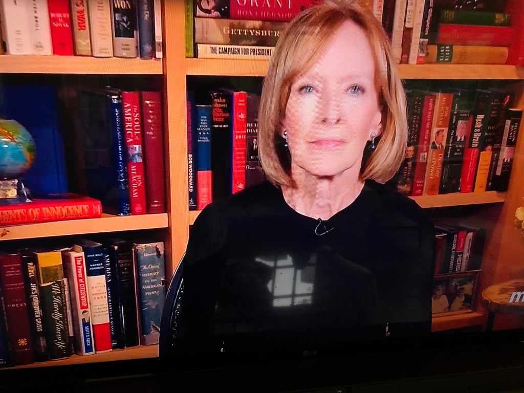 Speaking of LeBron, I might need to turn to sports players’ old looks to liven up this blog. Back in the studio, I could see Judy’s hands and tasteful watch. Now I am limited to her (admittedly lovely) torso. I’m begging any of you who know her to ask her to liven it up for one of her most ardent fans. Mary, I’d take pajamas.